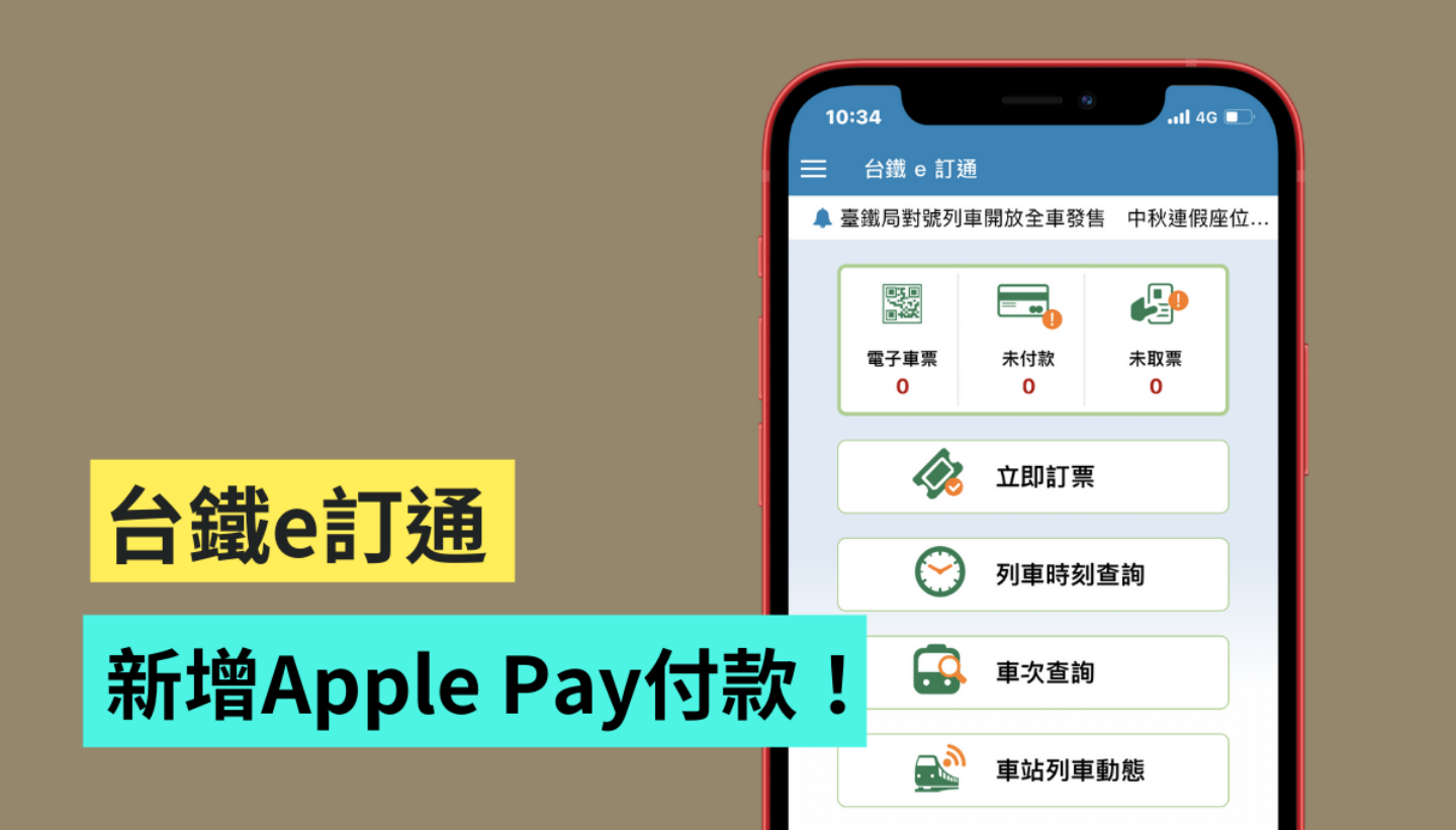 『 台鐵 e 訂通 』也可以用行動支付了!新增 Apple Pay 付款功能,購票更快更方便
